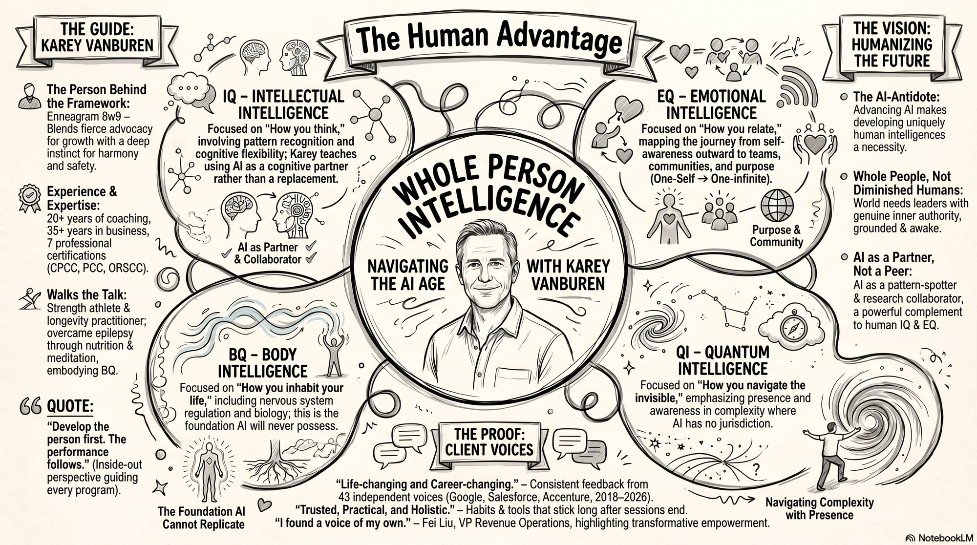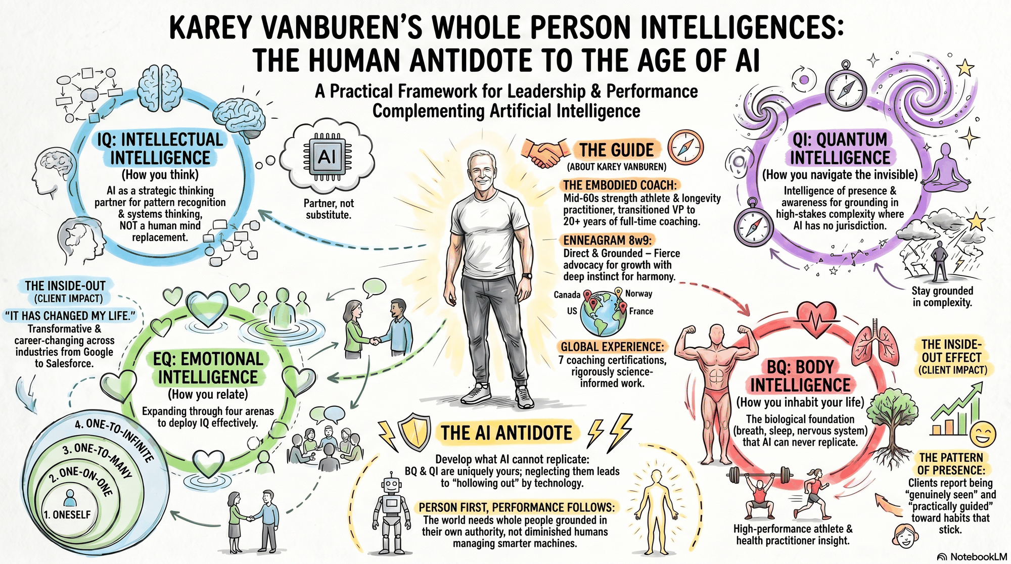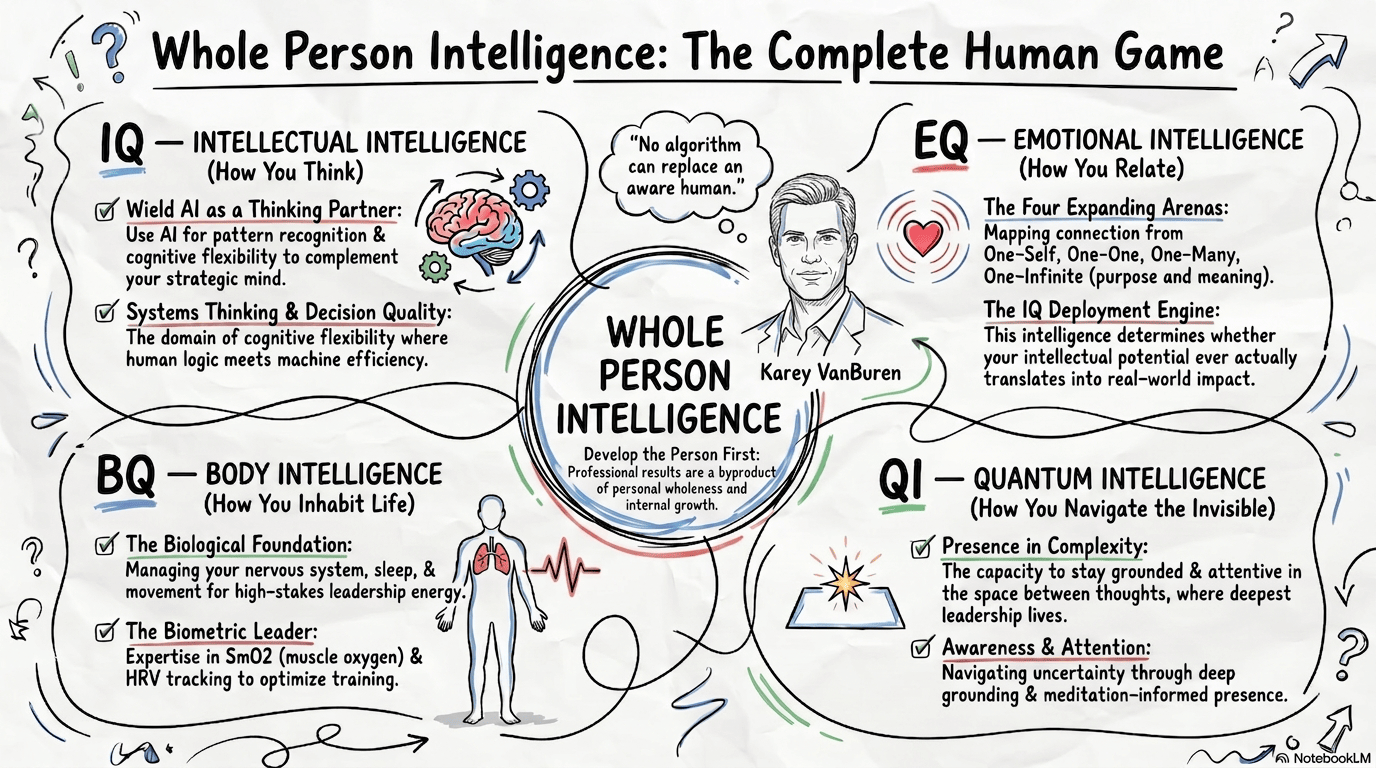 Whole-Person-Intelligence is an integrative framework developed by peak performance coach Karey VanBuren. It treats human capability as a dynamically coupled system of four intelligences -- IQ, EQ, BQ, and QI -- with AI positioned as a fifth, co-intelligence layer.