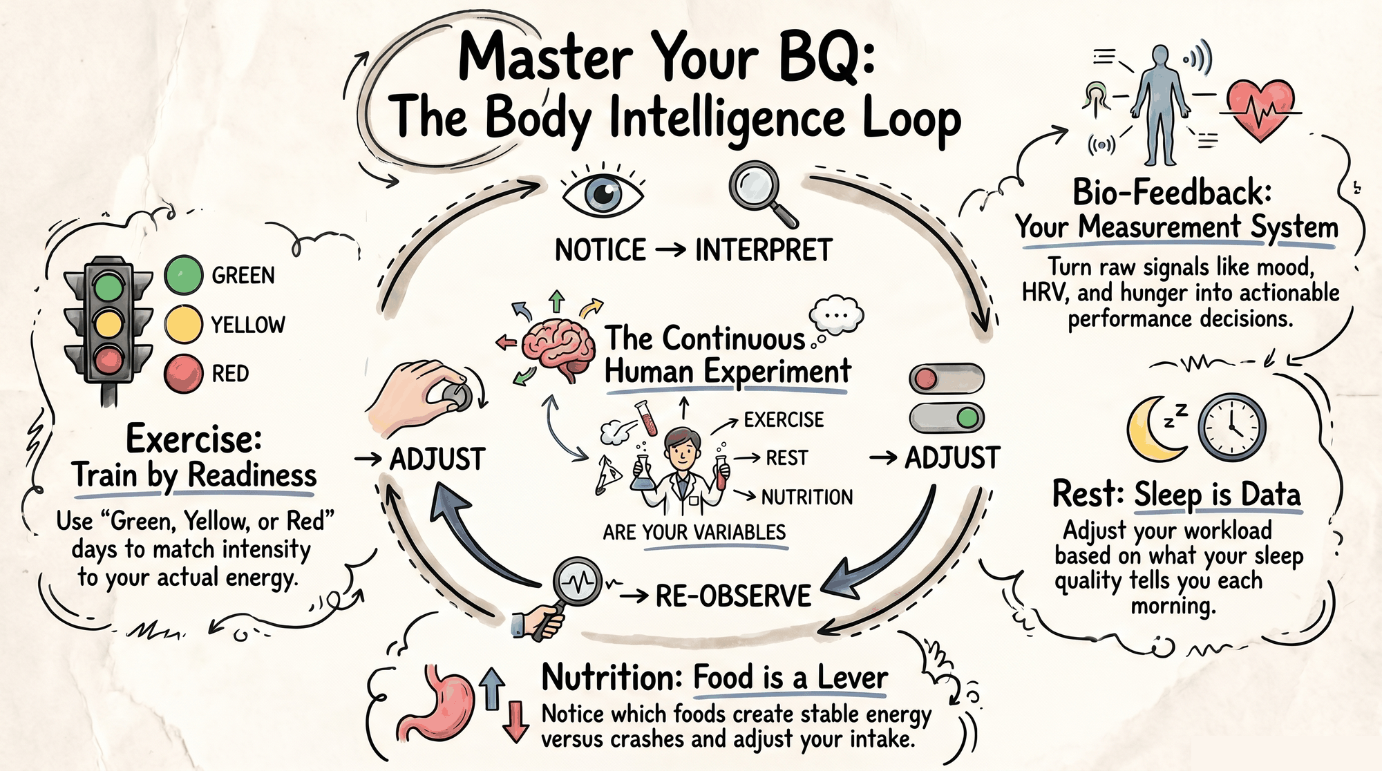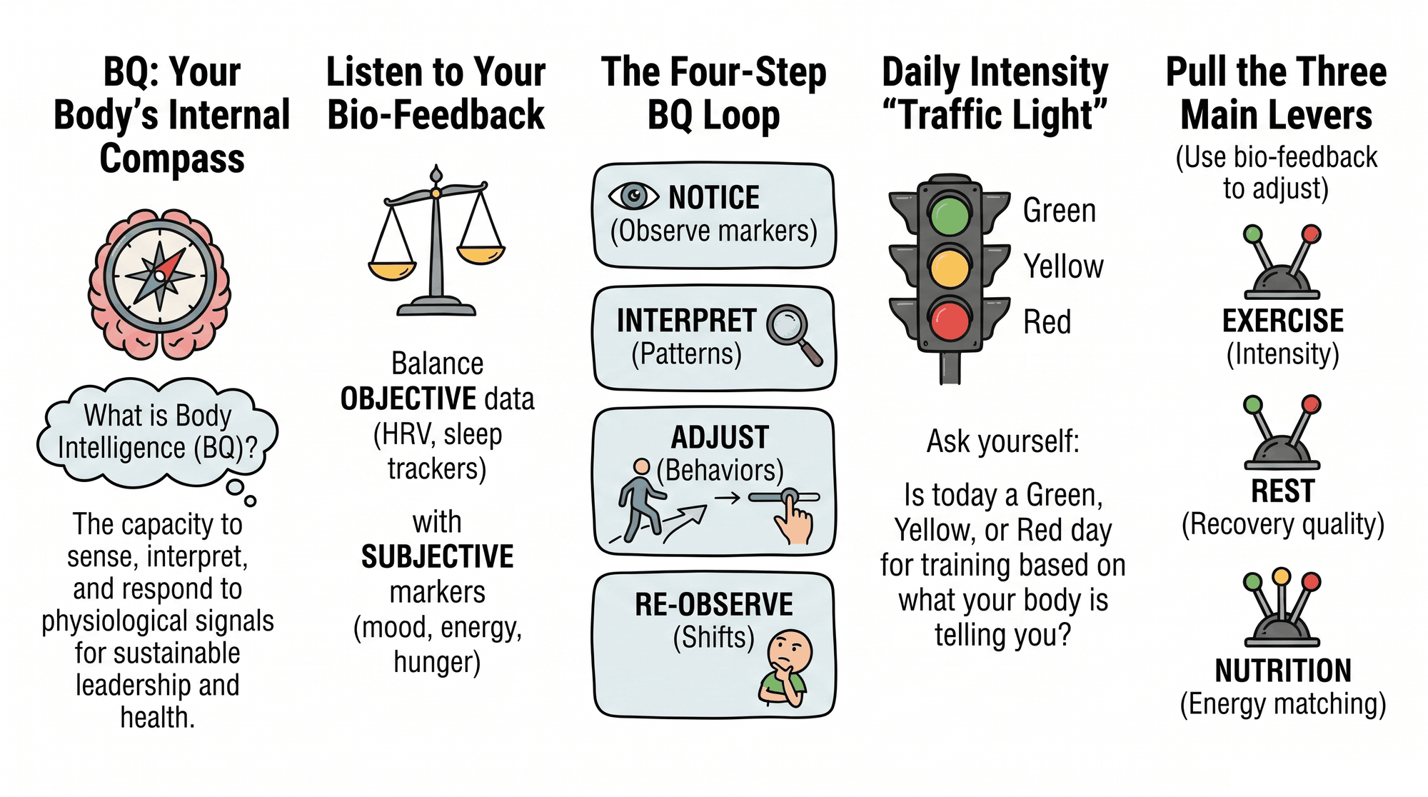 Bodily Intelligence (BQ) is the capacity to accurately sense, interpret, and respond to the body's physiological and subjective signals in real time, in service of health, performance, and sustainable leadership. Mechanically, it is a self-regulation loop: notice, interpret, adjust behavior (exercise, rest, nutrition), then notice again.