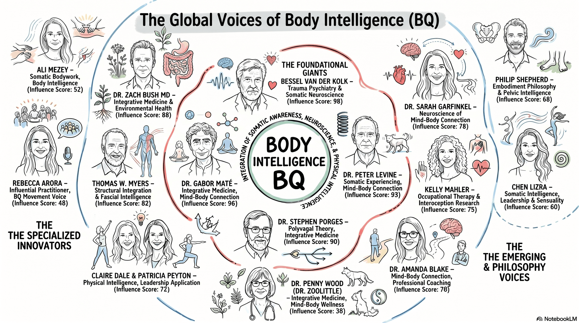 Curated from the Bodily_Intelligence_Leaders_2024 worksheet. Full columns (books, podcasts, papers, social reach) are available in the original xlsx; below is the abbreviated view.