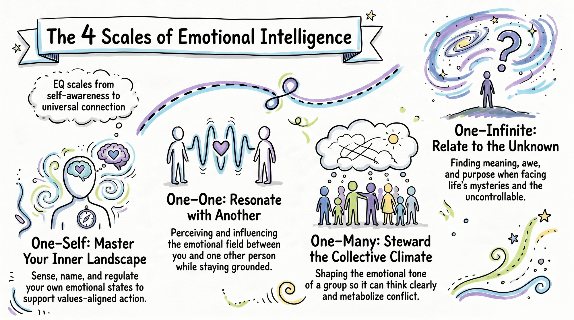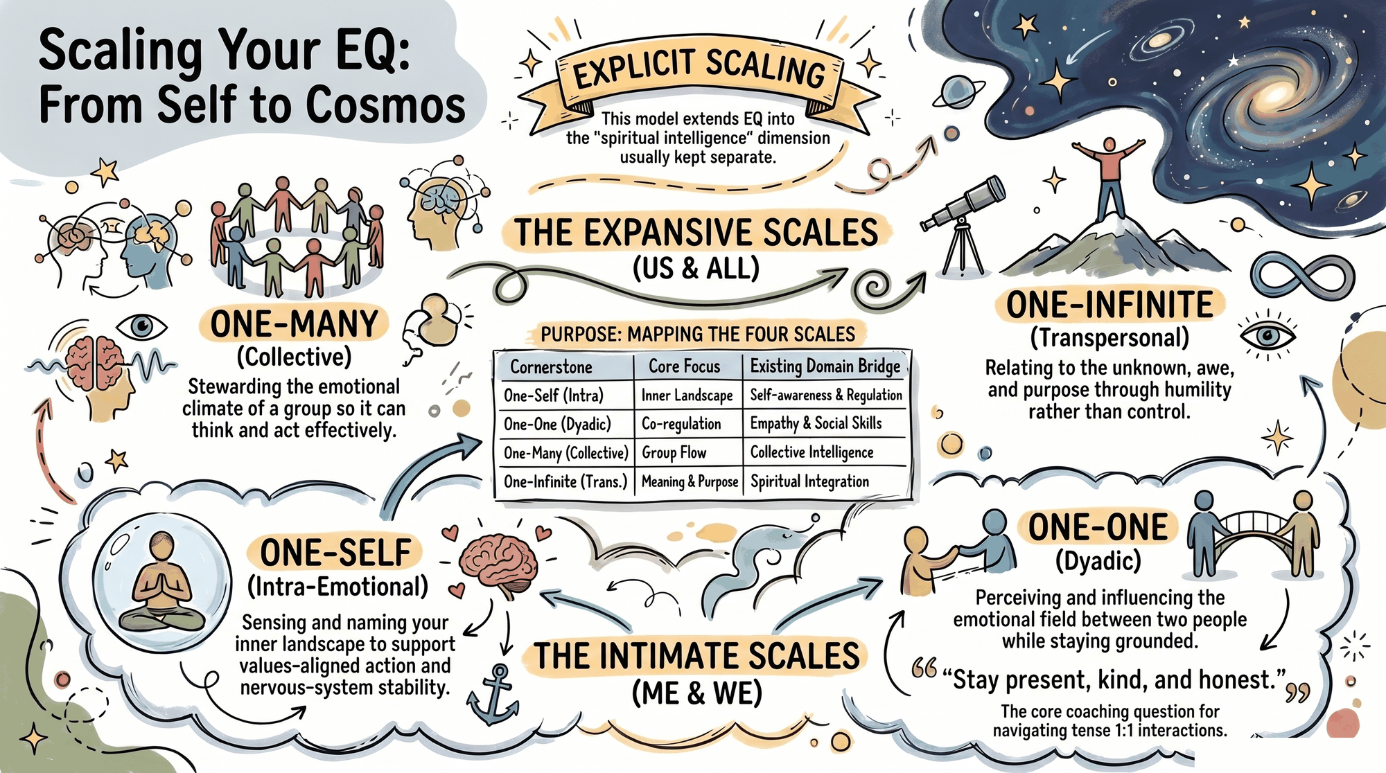 Emotional intelligence, as developed in this framework, scales across four cornerstones: intra-emotional (One-Self), dyadic (One-One), collective (One-Many), and transpersonal (One-Infinite). These map onto and extend the classical Goleman / Salovey-Mayer domains of self-awareness, self-regulation, empathy, and relationship management.
