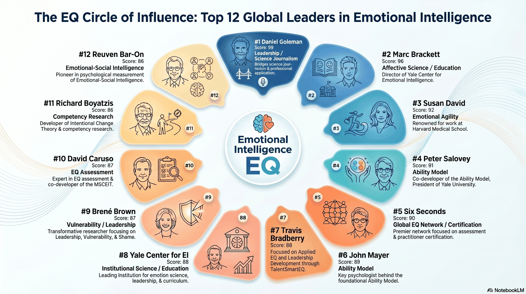 | 3 | Susan David | Psychology / Emotional Agility / Harvard Medical School | 92 | Extended EQ beyond "positive thinking" by showing that emotional skill includes facing difficult feelings honestly, with flexibility, self-compassion, and values-based action. | link |
