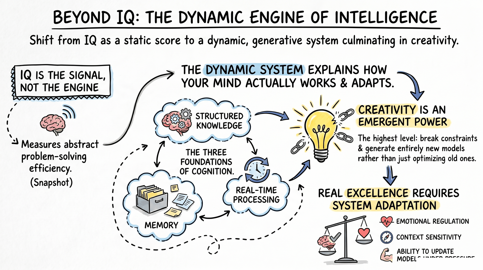 The practical upshot: high-IQ individuals can still perform poorly when their system cannot adapt in real conditions. Real-world excellence depends on model-updating speed, emotional regulation under load, context sensitivity, and learning loops over time -- and at the highest level, on the creativity that lets the system invent something it has never done before.