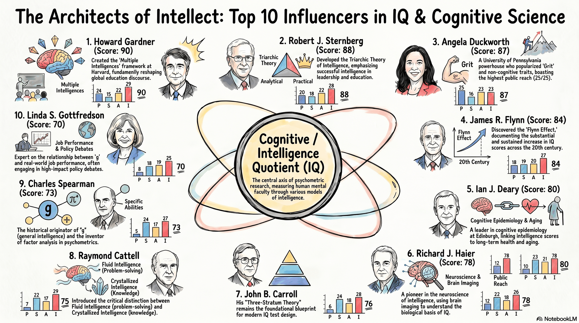Curated from the IQ_intelligence quotient_leaders_2026 worksheet. Full columns (books, podcasts, papers, social reach) are available in the original xlsx; below is the abbreviated view.