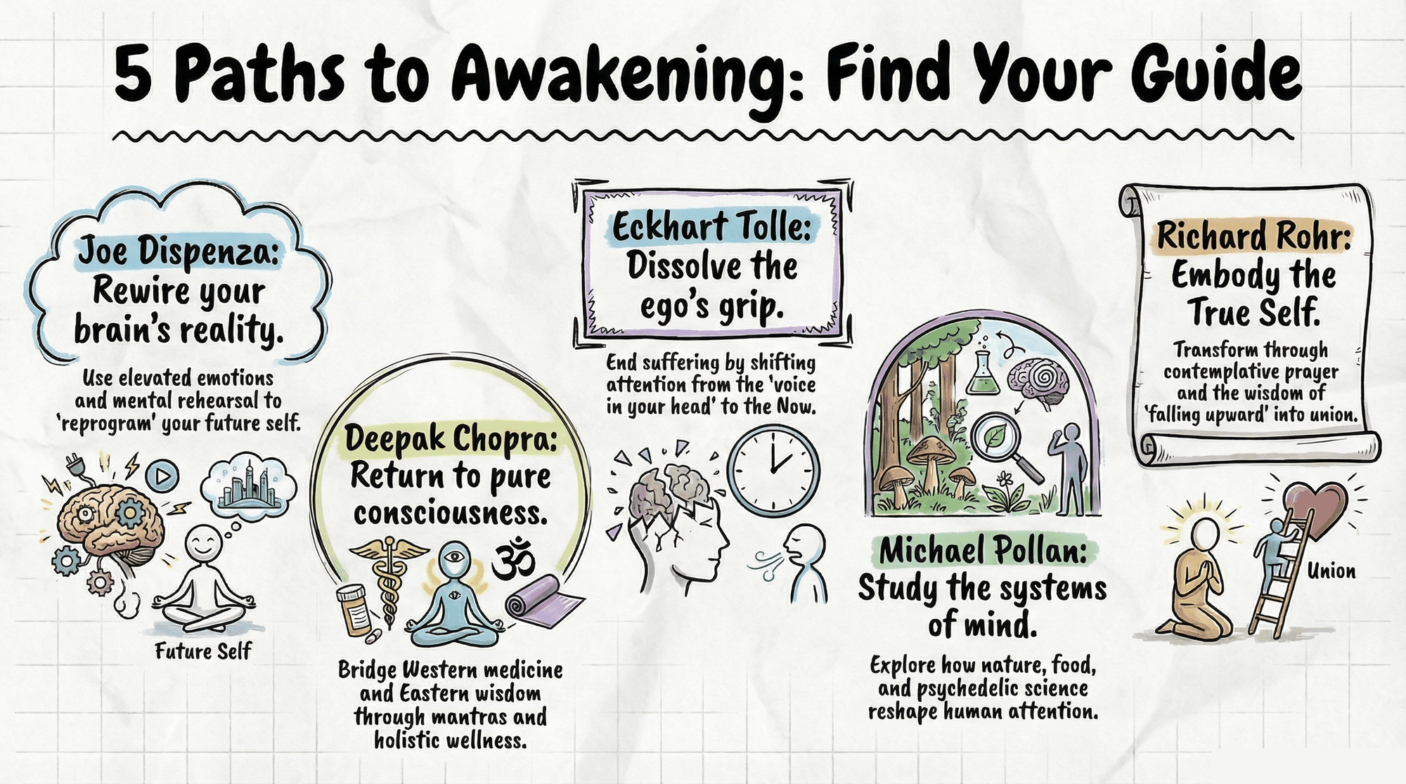 The contemplative edge runs from Eckhart Tolle's present-moment teaching to Vedic traditions (Deepak Chopra, Sri Sri Ravi Shankar and SKY breath), non-dual philosophy (Bernardo Kastrup's analytic idealism), and field-oriented thinkers like Rupert Sheldrake and Lynne McTaggart.